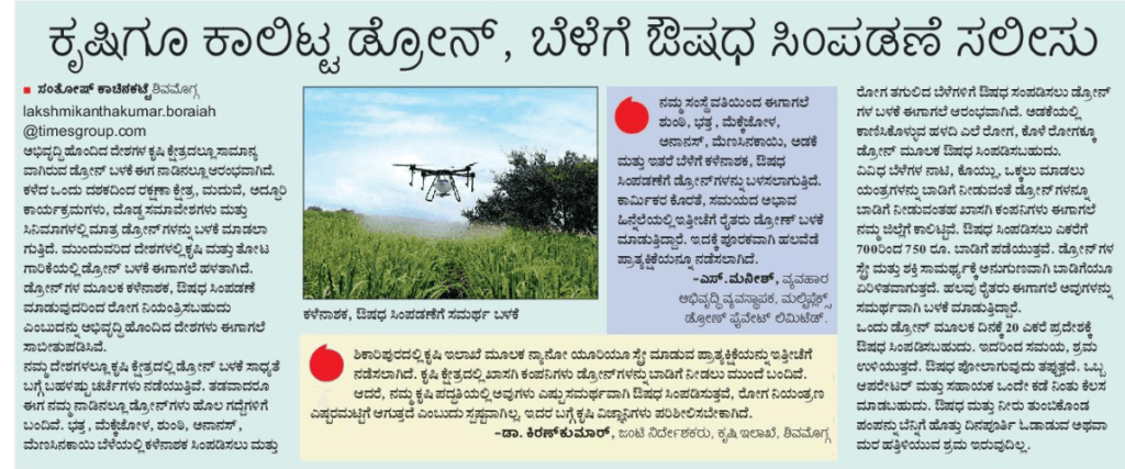 Article about usage of agricultural drones on Ginger and Pineapple was published in Vijaya Karnataka print media